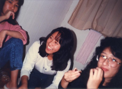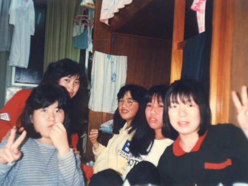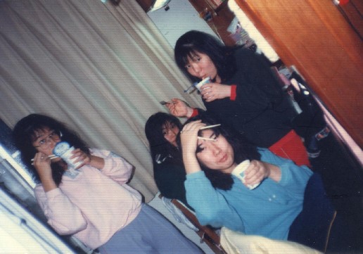 | 寮内は禁酒だったけど、たま〜に隠れて酒盛りすることも・・・。 写真左から マキさん:当時は癒し系キャラでした。今は・・・ ミオリちゃん:見た目は落ち着いているのに実はすごいドジな人。すぐ顔が赤くなる。 マー:いつも眠たそうな人でした。 るり:エロ本の朗読が得意。梨事件は今でも語り草。トホホ・・・ キャリー:色白でモチ肌。当時は一番の美乳の持ち主でした。 |