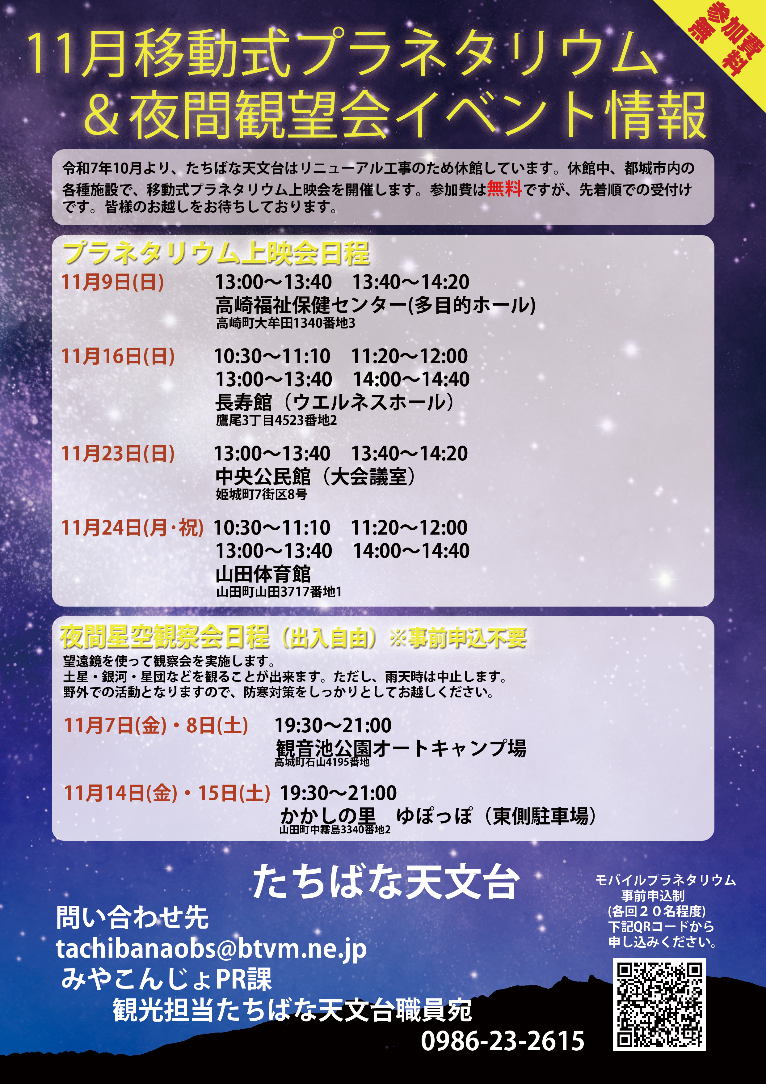 令和7年10月以降たちばな天文台では、モバイルプラネタリウム(移動プラネタリウム上映会)を開催いたします。 たちばな天文台 イベント受付ページ ※参加料:無料 ※先着順となります。 ※各回定員25名 ●11月9日日曜日 13:00~13:40 13:40~14:20 高崎福祉保健センター(多目的研修室) ●11月16日日曜日 10:30~11:10 11:20~12:00 13:00~13:40 14:00~14:40 長寿館(多目的研修室) ●11月23日日曜日 13:00~13:40 13:40~14:20 中央公民館(大会議室) ●11月24日月曜日 10:30~11:10 11:20~12:00 13:00~13:40 14:00~14:40 山田体育館